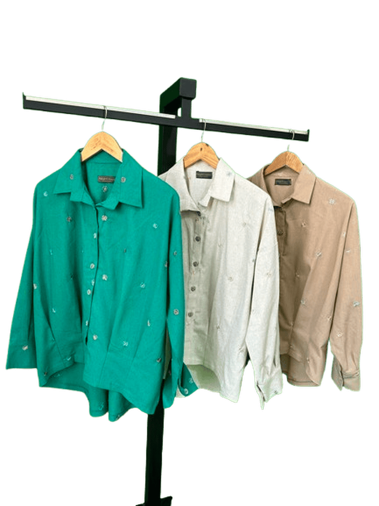 شومیز زنانه مدل گلبرگ دوخته شده از پارچه لینن با طراحی آزاد و فری‌سایز، مناسب استفاده روزمره و استایل شیک. در رنگ‌بندی کرم، نچرال و سبز عرضه می‌شود.